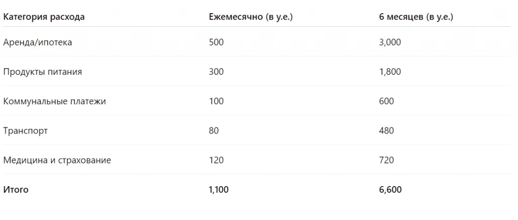 Таким образом, при ежемесячных базовых расходах в 1 100 у.е., ваша подушка должна составлять около 6 600 у.е. для уверенности на полгода.