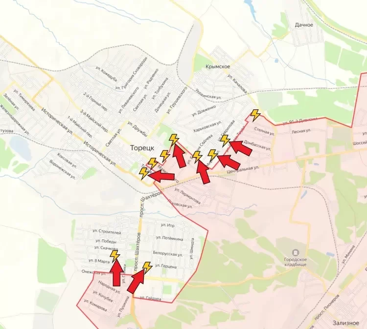 В центре Торецка (Дзержинска) продолжаются ожесточённые бои. Наши бойцы немного расширили зону контроля. В южной части Торецка, районе Забалка, пока что без серьёзных изменений. ВСУ оказывают ожесточённое сопротивление и завозят в город дополнительные резервы, провизию и боекомплекты. Так что городские бои могут продолжаться ещё довольно долго.