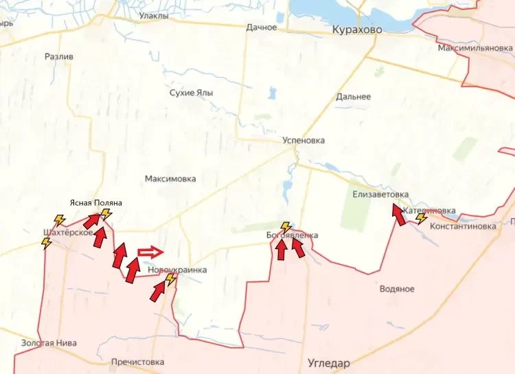 Подразделения ВС РФ практически полностью зачистили Шахтёрское от присутствия вражеских сил. Помимо этого, наши бойцы продвинулись на северо-востоке и подошли к окраинах населённого пункта Ясная Поляна. В Новоукраинке продолжаются встречные бои в юго-западной части населённого пункта. Также наши бойцы расширили зону контроля между Шахтёрским и Новоукраинкой, сообщает PulsePen. Так что, если дела у наших бойцов в селе пойдут не лучшим образом, другие подразделения могут постепенно выйти к северо-западным и северным окраинам. В Богоявленке бои идут на северных окраинах, где по-прежнему находятся вражеские силы.