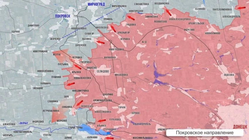 На Покровском направлении ВС РФ взяли под контроль зону севернее Берестков и ведут бои за позиции западнее. Цель - спрямить фронт к восточной окраине Сонцовки. Западнее Селидово наши продвигаются севернее Зари, а также к Пушкино и Украинке. По последним данным, наши зачищают Желтое - то есть наша армия менее чем в 13 км от пос. Удачное, где находятся главные шахты с коксующимся углем, о которых говорят как о главной ценности Покровска. На участке трассы Селидово-Покровск ВС РФ двигаются в направлении Даченского.