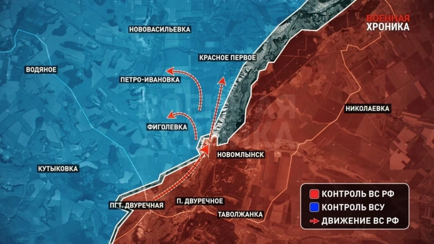 На Купянском фронте, по сообщению с мест, ВС РФ освободили Новомлынск и отбили господствующие высоты в 1-1,5 км севернее. Площадь нашего плацдарма увеличилась до 32 км², можно двигаться как на северо-запад - между двумя линиями обороны ВСУ, или на юг - к Купянску.