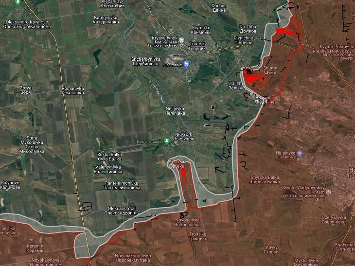 На Торецком направлении российские войска имеют тактические успехи в районе Дружбы, Шумы и Пивничное (Кирово). Восточнее посёлка Дружба ВС РФ закрепились на глубину до 320 метров;