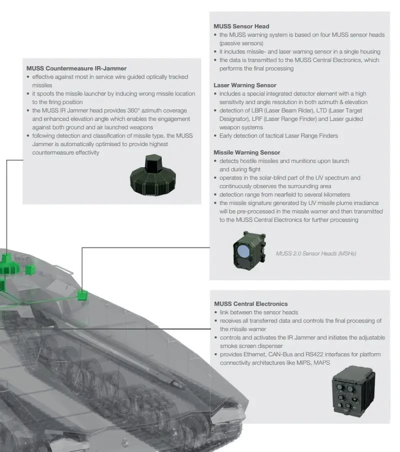 MUSS предназначена для противодействия ПТУР и боеприпасам с лазерным наведением. За последние 8 лет для первой партии БМП PUMA было поставлено более 350 систем MUSS.