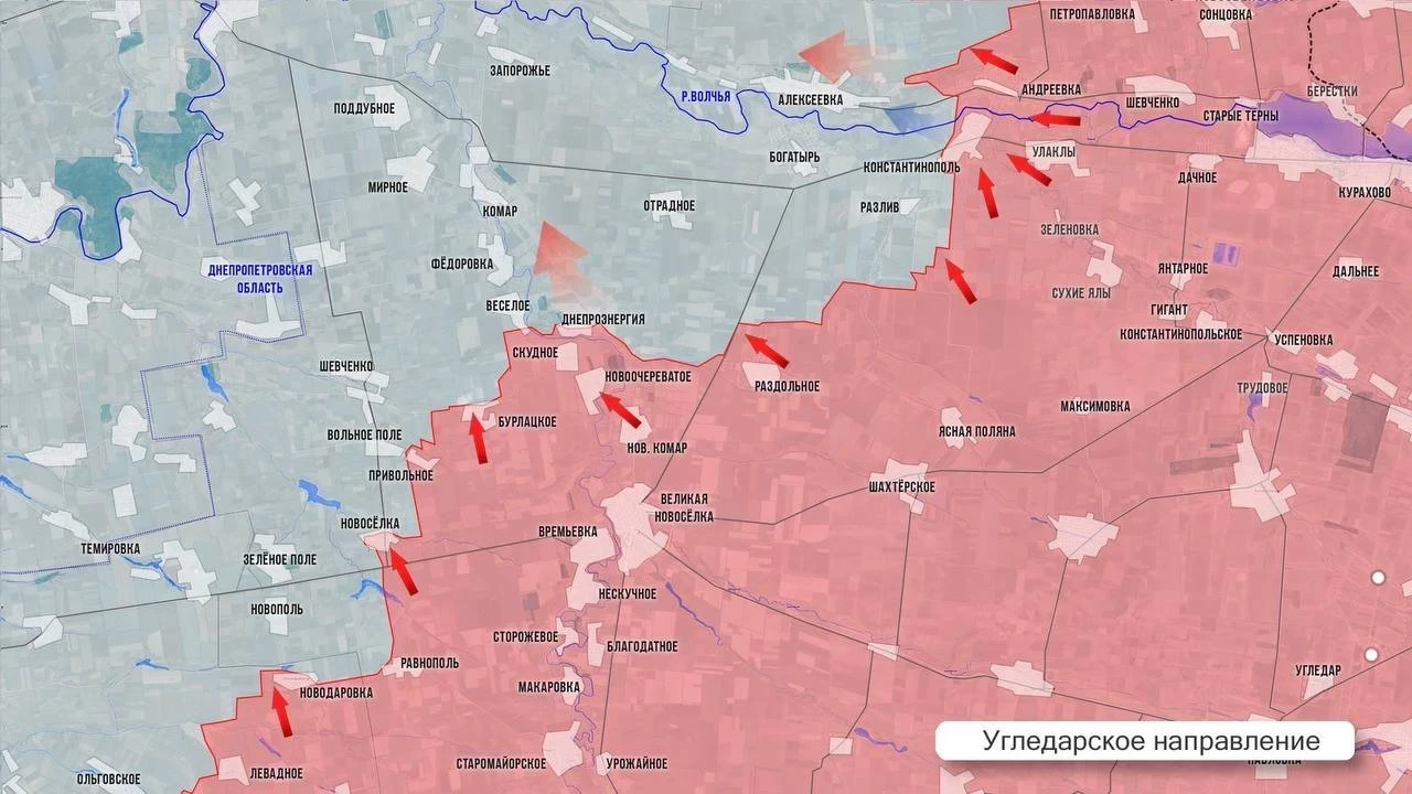 На Угледарском фронте армия России продолжает продвижение в районе Вольного Поля и Весёлого. Судя по отдельным текстовым заявлениям с мест, наши штурмовики вышли на окраины Разлива.