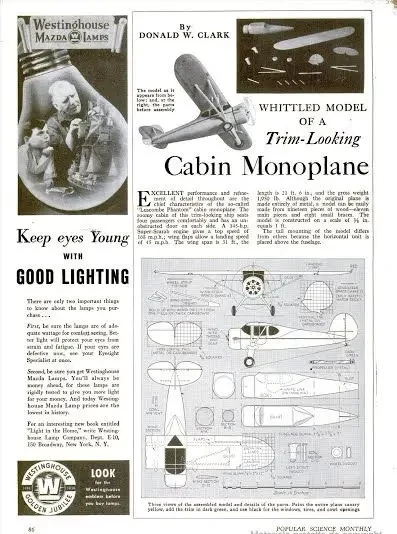 Обычно о том, как сделать модель самолета за рубежом рассказывалось в специальных изданиях для авиамоделистов. Но были об этом и материалы в журнале «Популярная наука». Вот, например, прямо-таки вылитый «Пайпер Куб», ну, или один из подобных ему самолетов. Такой самолет должен был по идее сниматься в кинофильме 1954 года «Последний дюйм», но в нем его с успехом заменил «Як-12»
