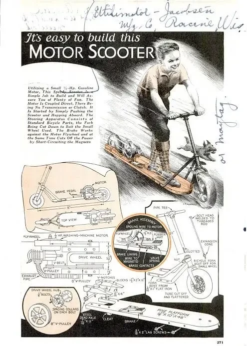 А это электросамокат. Сегодня они стоят перед чуть ли не каждым крупным сетевым магазином. А тогда их предлагалось делать самостоятельно!