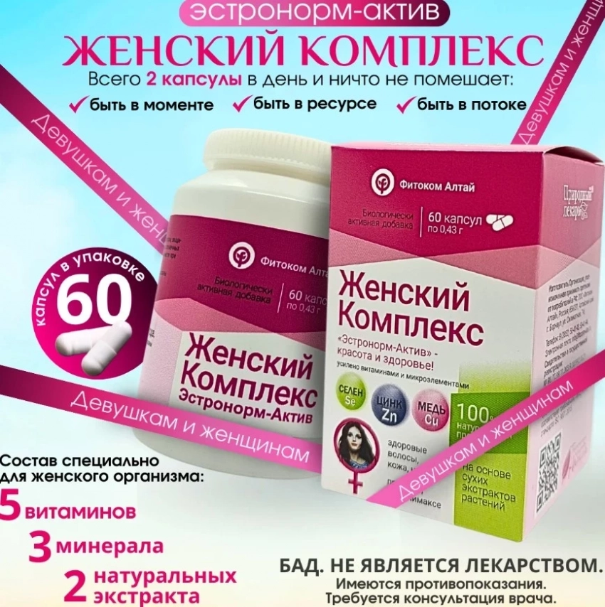 Женский комплекс Эстронорм-Актив витаимины при климаксе и ПМС 60 капсул от Фитоком Алтай