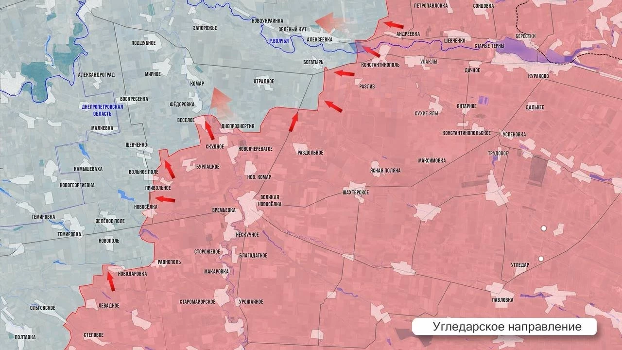 На Покровском фронте ВС РФ рвутся к границе Днепропетровской обл. Есть продвижение в Орехово, где противника постепенно выдавливают с центральной улицы. МО РФ сообщило об освобождении Котляровки. ВС РФ продвинулись по лесопосадкам западнее Новоалександровки и фактически вышли на окраины Новониколаевки – еще одного приграничного села. В Удачном и Котлино ВСУ контратакуют, наши держат позиции. В Зверево и в районе южных окраин Леонтовичей тяжёлые бои за контроль над двумя терриконами, которые пока под контролем ВСУ. Со стороны Нового Труда наши войска стараются продвинуться в сторону Новоукраинки и Бельгийки.