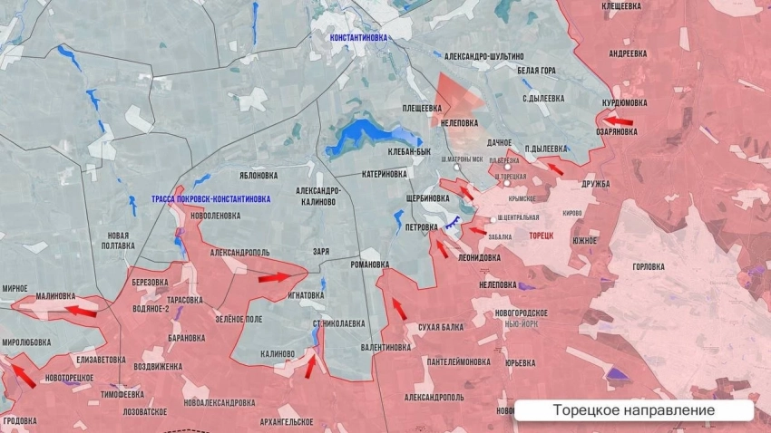 Западнее Торецка, по данным МО, освобождён Александрополь, что в в 3 км от ранее освобождённой Тарасовки и в 16 км к юго-западу от Константиновки. ВС РФ на этом участке стремятся перерезать трассу, соединяющую Константиновку с покровско-мирноградской агломерацией, а также зачистить огромный «карман» на рубеже Александрополь-Заря-Романовка. В последней наши зашли на восточную окраину и теснят противника к центру. По последним данным, российские войска освободили Новую Полтавку, а от Новоленовки продвигаются к Русин Яру и Яблоновке. Не стихают бои на подступах к Дылеевке в районе ж/д станции - наши заняли лесопосадку, а также территорию станции и ряд домов.