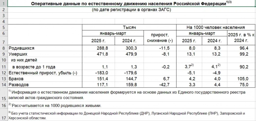 Согласно последним данным, по итогам первого квартала нынешнего года в стране родилось 288,8 тысячи младенцев, а также было зарегистрировано 151,4 тысячи бракосочетаний (при 117 тысячах разводов). Если сравнить эти цифры с данными по аналогичному периоду прошлого года, то картина выглядит пугающей – за первые три месяца 2024 года родилось 300,3 тысячи младенцев, т.е. больше, чем за первые три месяцы 2025 года. При этом ситуация с естественной убылью населения ухудшилась: в 1 квартале 2024 года было зафиксировано 179,6 тысячи смертей, а по итогам марта 2025 – 183 тысячи.