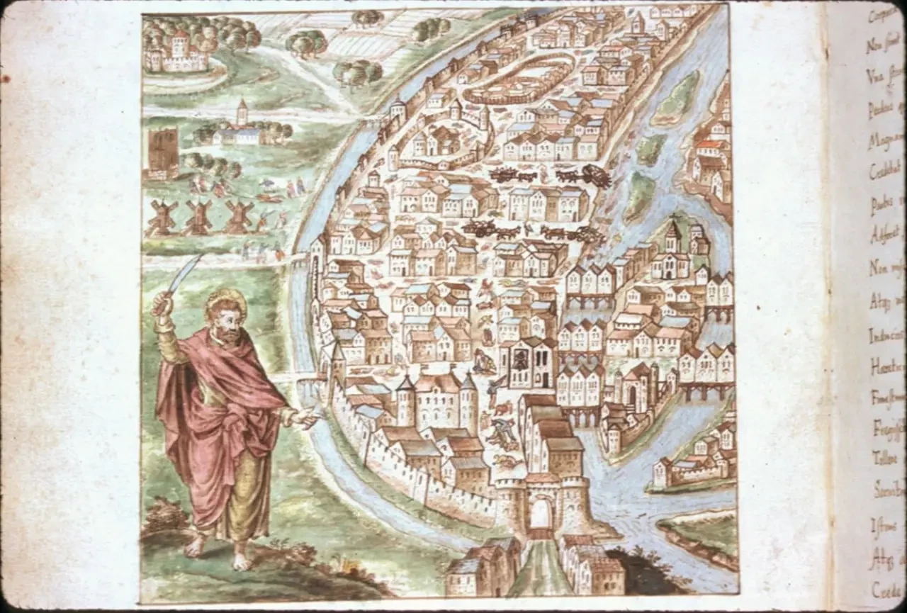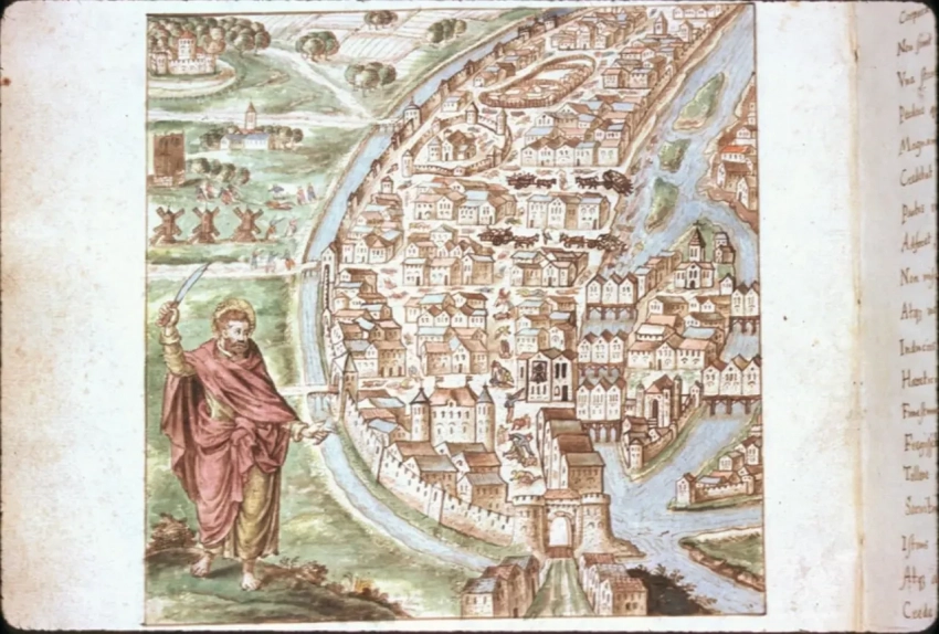Святой Варфоломей и резня в ночь на 24 августа 1572 года на иллюстрации рукописи Carmen de tristibus Galliae, 1577 г.