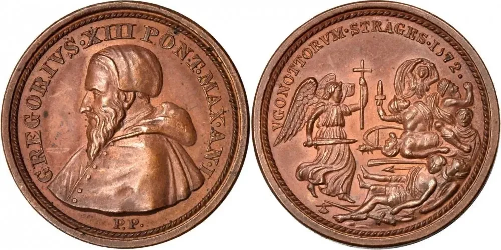 Медаль, изготовленная по приказу папы римского Григория XIII в честь событий Варфоломеевской ночи