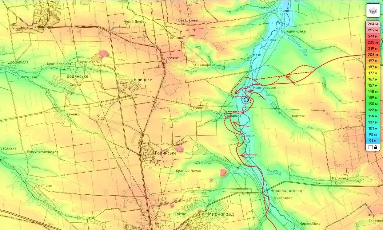 Восточнее Покровска, в районе реки Казённый Торец, подразделения 51-й армии расширяют плацдарм. За двое суток они полностью освободили село Разино и практически выбили ВСУ из Новоторецкого, где украинские силы удерживают лишь южную часть села и лишены снабжения.
