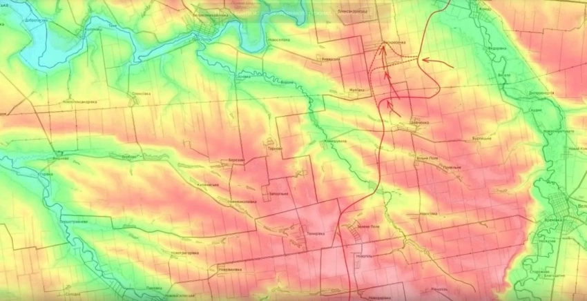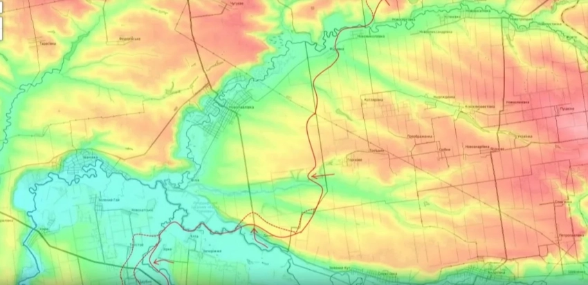 Кроме того, наши части постепенно обходят населённый пункт Муравка, а именно это осуществляется с юго-запада и постепенно перерезается дорога на Новопавловку.