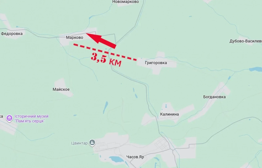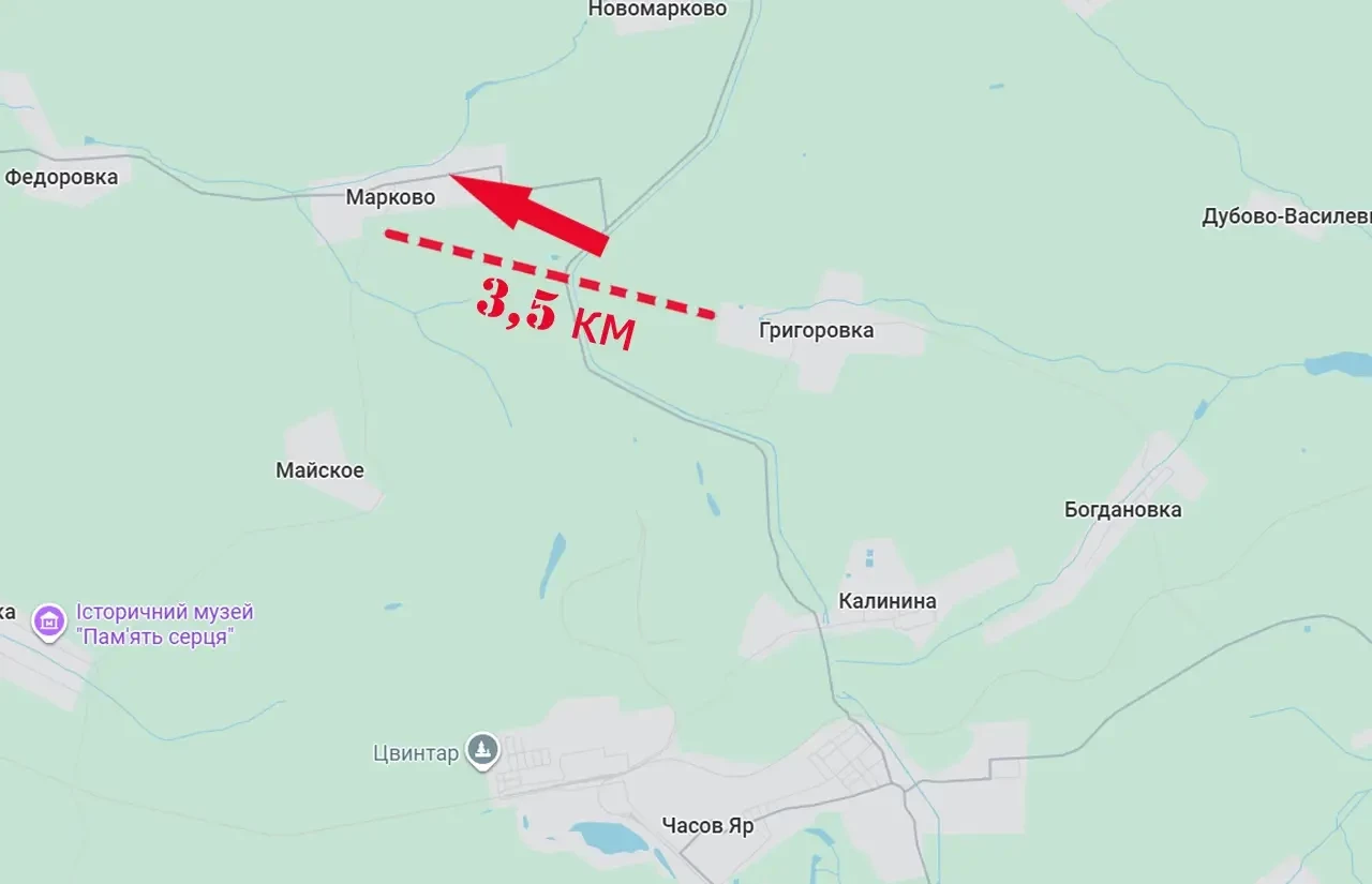 Рассмотрим ситуацию с заявлением министерства обороны об освобождении села Марково, что к северо-западу от Артёмовска. Марково находится в 11 км от южной окраины Краматорска и примерно в 3,5 км от той линии фронта, которую рисовали паблики в Телеграме, соцсетях.