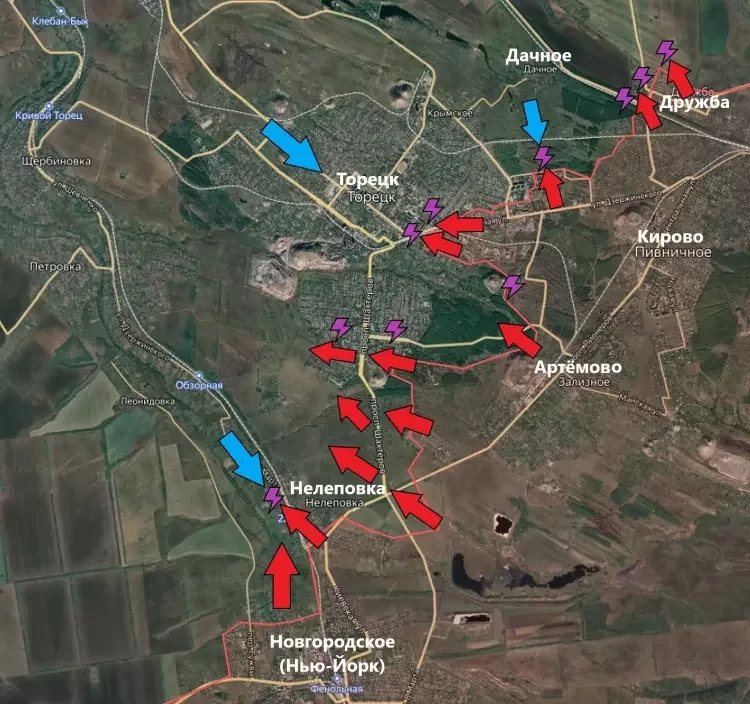 В Торецке (Дзержинске) ВС РФ продвинулись к югу от исправительной колонии, выбив ВСУ с позиций к востоку от террикона и «поджавшись под него». Сам террикон на данный момент является серой зоной, занять на нем позиции не могут ни ВС РФ, ни ВСУ из-за огня артиллерии и БПЛА. Кроме того, в частном секторе к югу от Центральной улицы также по некоторым данным есть успехи ВС РФ, однако с учетом городских боев и отсутствия кадров объективного контроля определить масштаб продвижения пока не представляется возможны, пишет PulsePen.