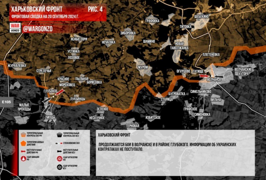 На Харьковском направлении, как информирует Telegram-канал Wargonzo, продолжаются бои в Волчанске и в районе Глубокого. Информации об украинских контратаках не поступало.