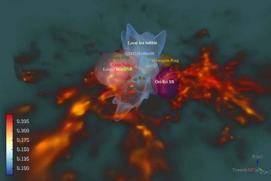 Благодаря предыдущим исследованиям мы знаем, что LHB, вероятно, был продуктом взрывов сверхновых, которые взорвались как цепочка петард, около 14,4 миллионов лет назад . Положение Солнечной системы в центре пузыря — это просто забавное космическое совпадение. Но форма ЛГП осталась плохо определенной — своего рода кляксообразная, пухлая конфигурация, похожая на костяшку.