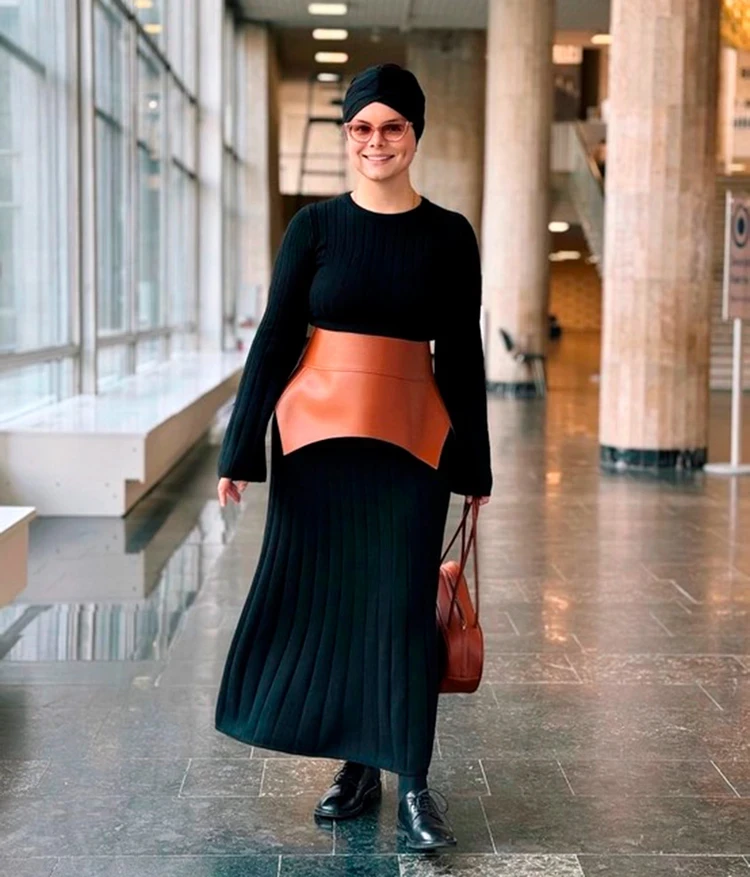 Женя Петросяна также составила выходной образ, а главным акцентом сделала баску из светло-коричневой кожи. «Поясом» Татьяна дополнила черное трикотажное платье, которое она сочетала с ботинками на плоском ходу и коричневой сумкой-таксой. Разумеется, в случае Татьяны не обошлось без оригинального головного убора, в этот раз она использовала тюрбан.