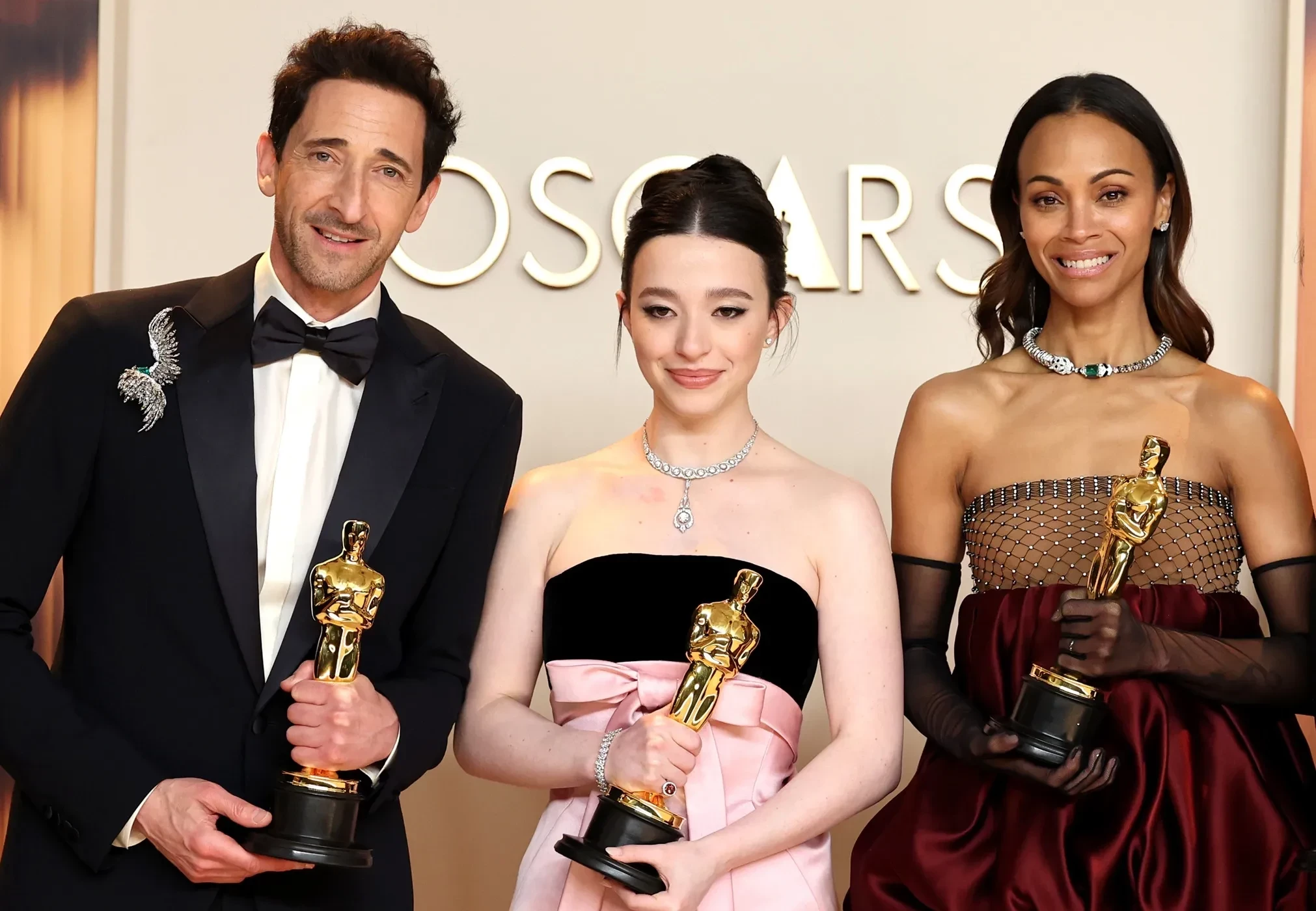 Эдриан Броуди, Майки Мэдисон и Зои Салдана/Фото: Mike Coppola/GettyImages