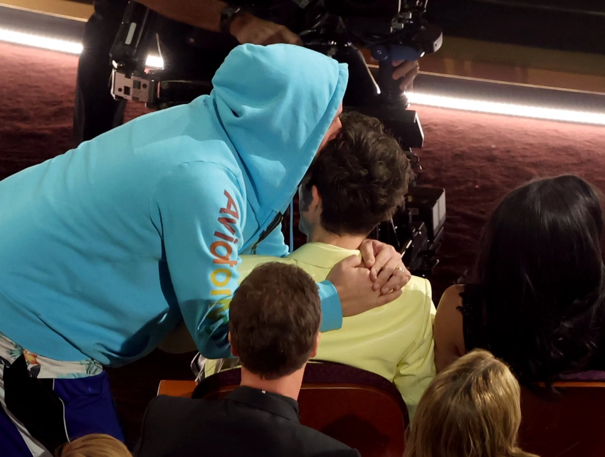 Тимоти Шаламе и Кайли Дженнер приковали к себе внимание на "Оскаре", вновь появившись в компании друг друга. Хотя 27-летняя звезда реалити не сопровождала 29-летнего актёра на красной дорожке церемонии, она появилась с ним на первых местах в зрительном зале в кастомном платье Miu Miu. Пара, которую многие подозревают в пиар-романе, показала чувства на публику: Шаламе и Дженнер поцеловались под вспышками камер. При этом рядом была семья актёра: на красную дорожку он вышел с мамой, на церемонии также присутствовали его отец и сестра Полин.