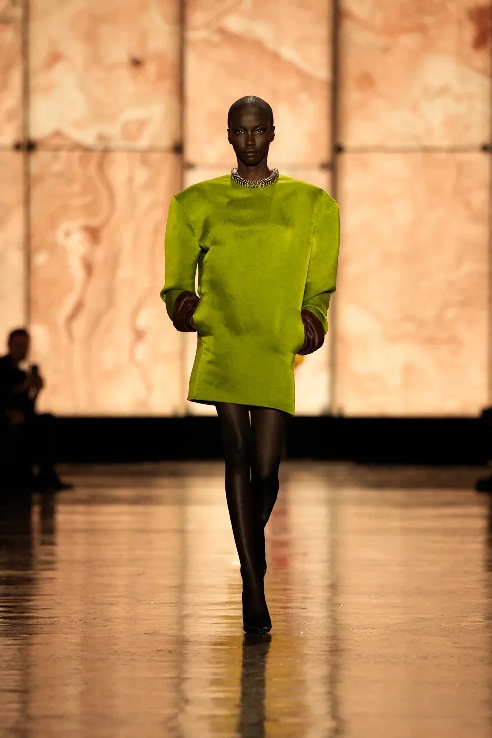 По подиуму прошлись Белла Хадид и обладательница титула "Модель года — 2024" Анок Яй, которые пропустили весь сезон и вышли только на шоу Saint Laurent. Анок перед показом сменила имидж и побрилась налысо.