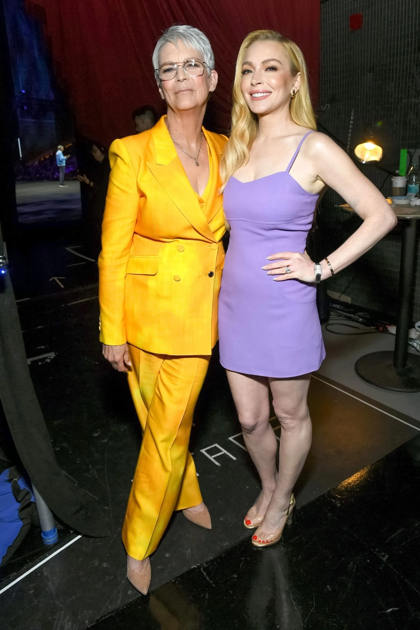 38-летняя Лохан, которую подозревают в преображении с помощью пластики, для выхода в свет выбрала мини-платье на бретельках и "прозрачные" туфли. 66-летняя Кёртис появилась перед зрителями шоу в ярко-жёлтом брючном костюме.