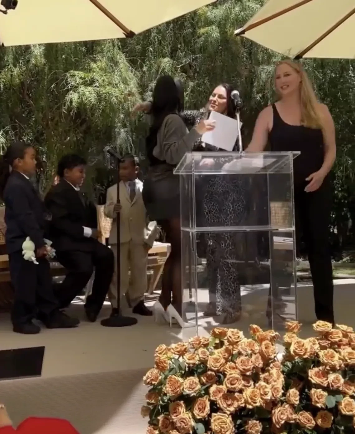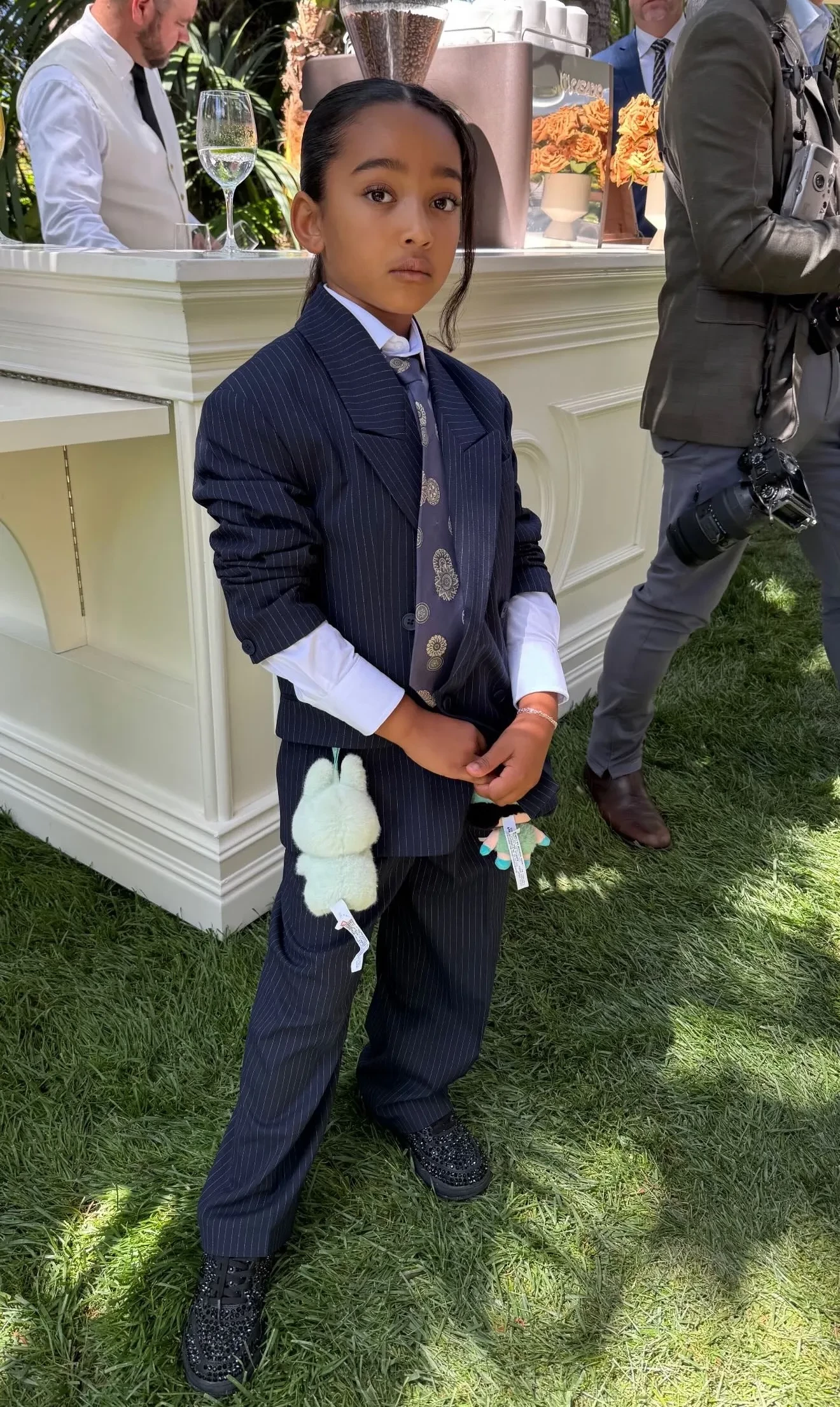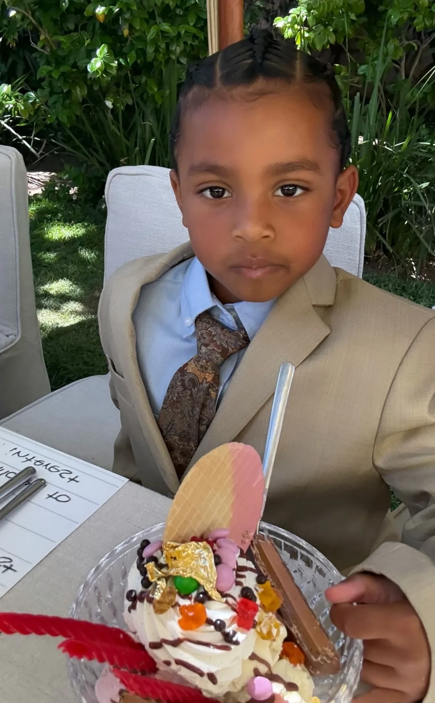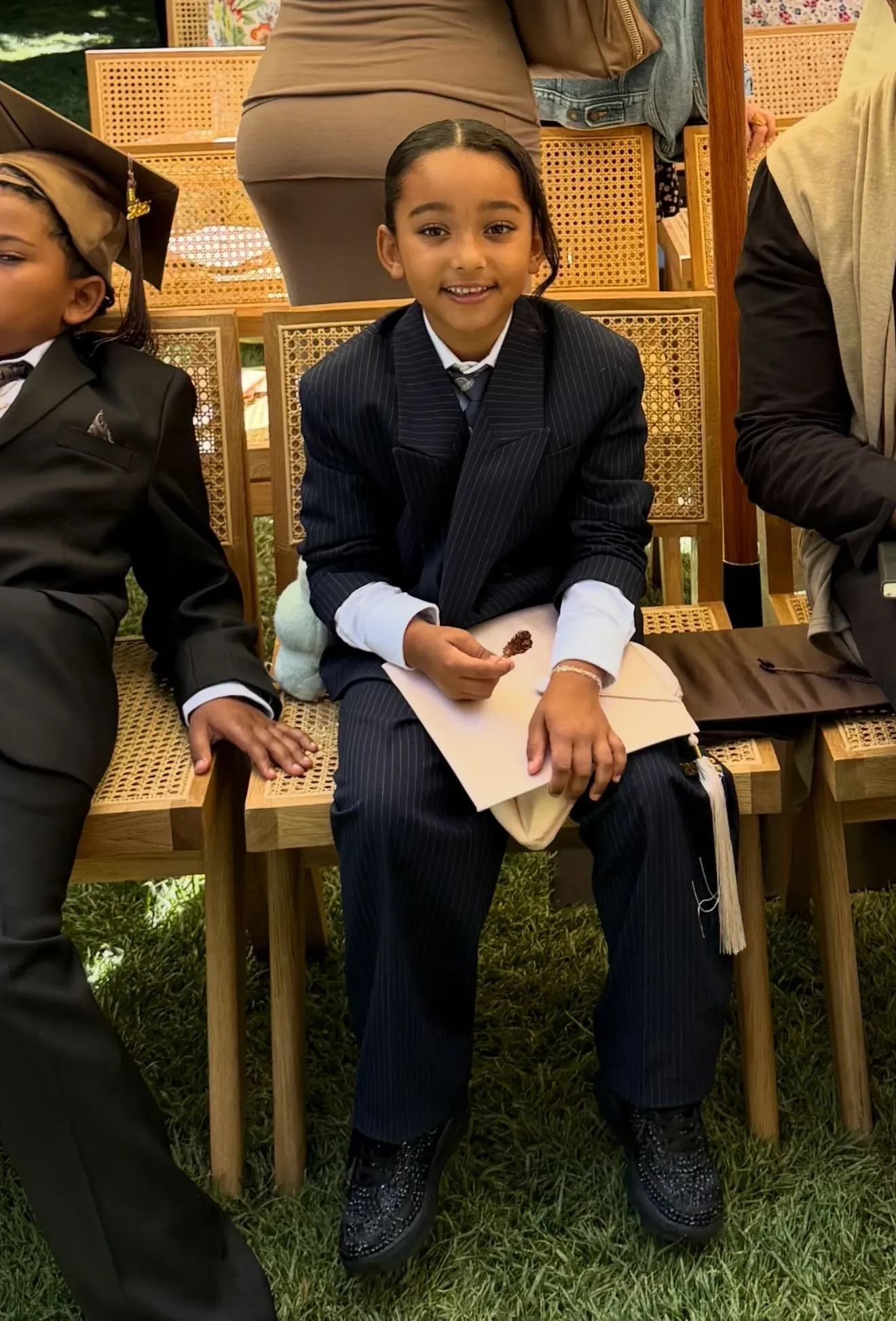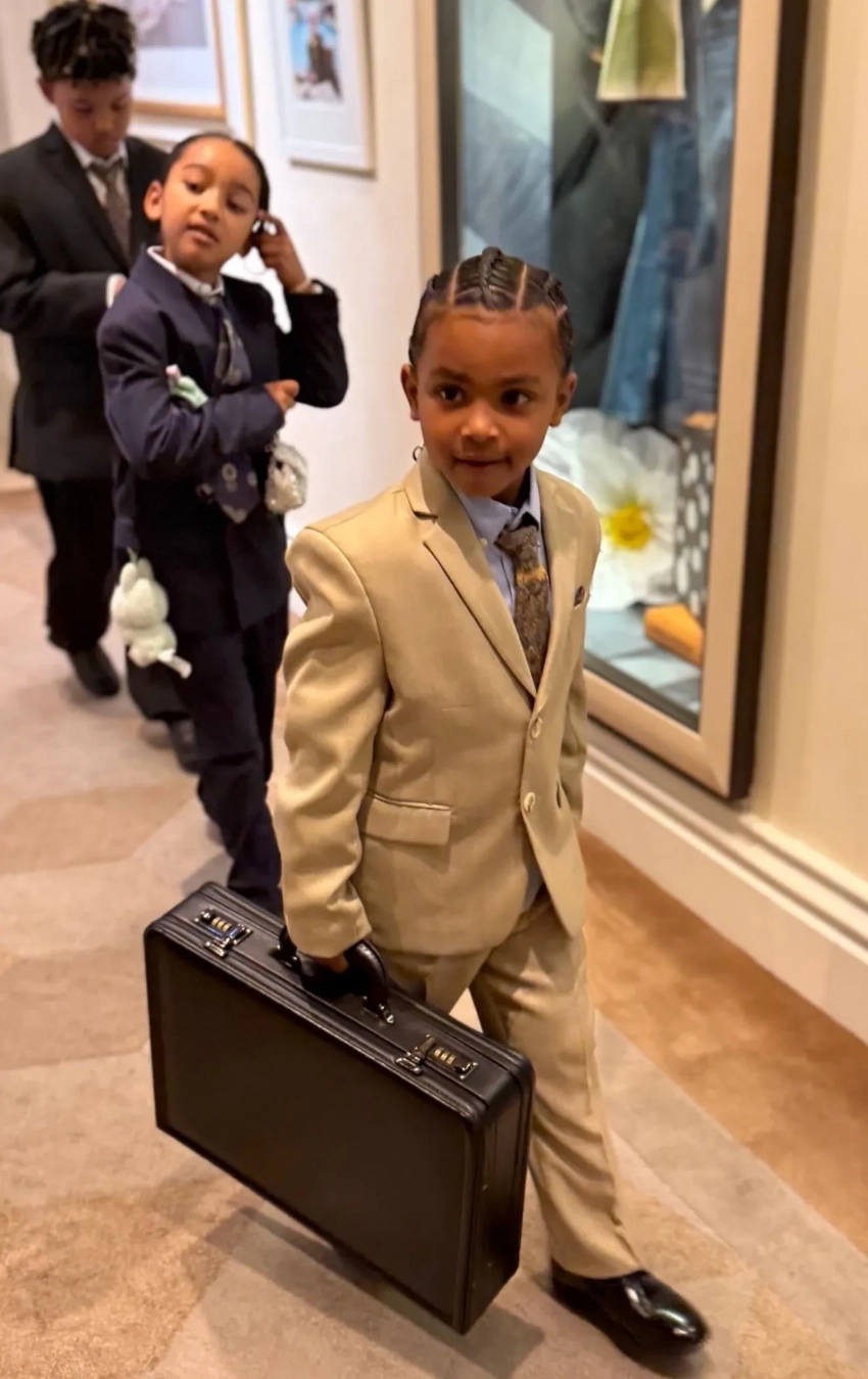 Псалм УэстНа выпускной пришли трое из четырёх детей Ким от Канье Уэста. Старшая и самая популярная из них, Норт, пропустила мероприятие. Младшего сына Псалма Ким нарядила в образ своего отца, известного адвоката Роберта Кардашьяна, а дочери Чикаго достался мемный лук матери на фоне Гарвардской школы.