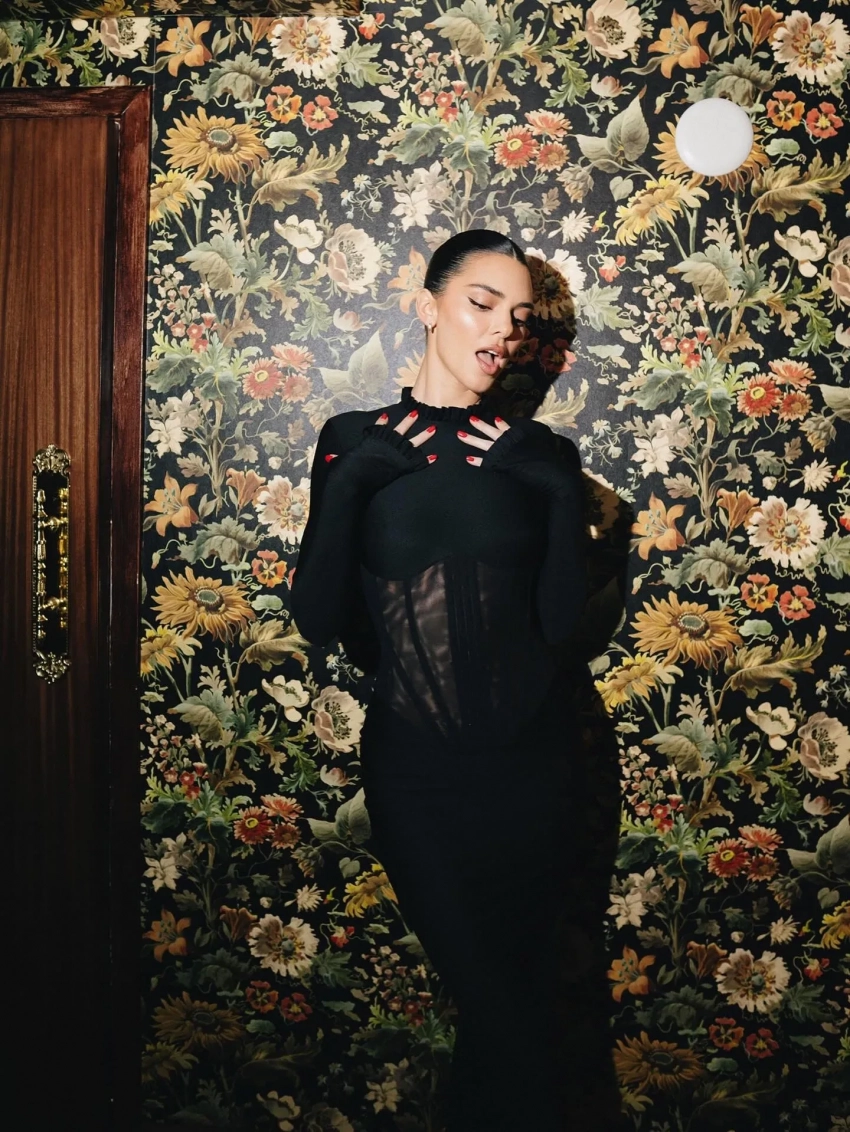 Для вечера Кайли выбрала красный топ и бежевую мини-юбку, а "помолодевшая" после пластики Крис Дженнер позировала в чёрном комплекте и солнцезащитных очках. Хейли Бибер и Кендалл Дженнер появились в нарядах из новой коллекции: Хейли — в платье телесного цвета, а Кендалл — в чёрном облегающем макси с полупрозрачной корсетной вставкой.