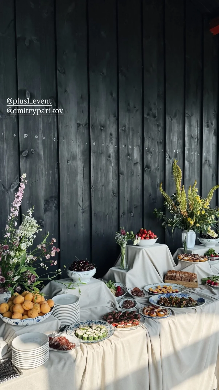 Свадьба Кристины ХоронжукПразднование прошло в деревне Ожигово в Подмосковье на территории гастропространства шеф-повара Дмитрия Парикова "На Даче". Гостей угощали разнообразными закусками, сезонными фруктами и ягодами и поили чаем из самовара. При оформлении декора вдохновлялись местной природой: пространство было украшено полевыми цветами, а узоры на посуде повторяли мотивы. На свадьбе собрались только родственники и близкие друзья пары.
