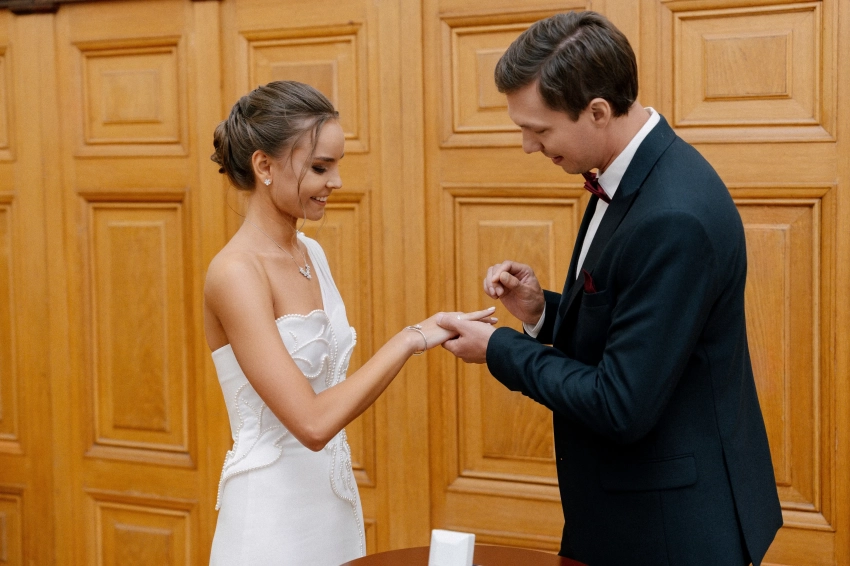 Сегодня в сети появились новые снимки со свадебной фотосессии и из ЗАГСа: фотосессия молодожёнов прошла в отеле "Балчуг Кемпински". На снимках невеста позирует в платье с разрезом бренда "Хохлома x Алёна Ахмадуллина" и в украшениях Mercury.