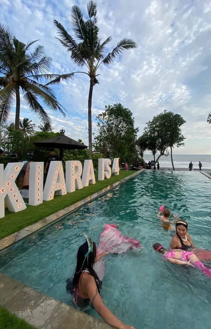 Алеся Кафельникова и Георгий Петришин с дочерьюАлеся Кафельникова и Георгий Петришин с дочерьюАлеся Кафельникова и Георгий Петришин с дочерьюДень рождения Киары прошёл на берегу океана, предположительно на Бали, где Кафельникова часто живёт с семьёй. Территорию у бассейна украсили надувной замок и воздушные шары. Детей и взрослых развлекали аниматоры-русалки, угощали разноцветным тортом, а вечером был фейерверк на пляже.