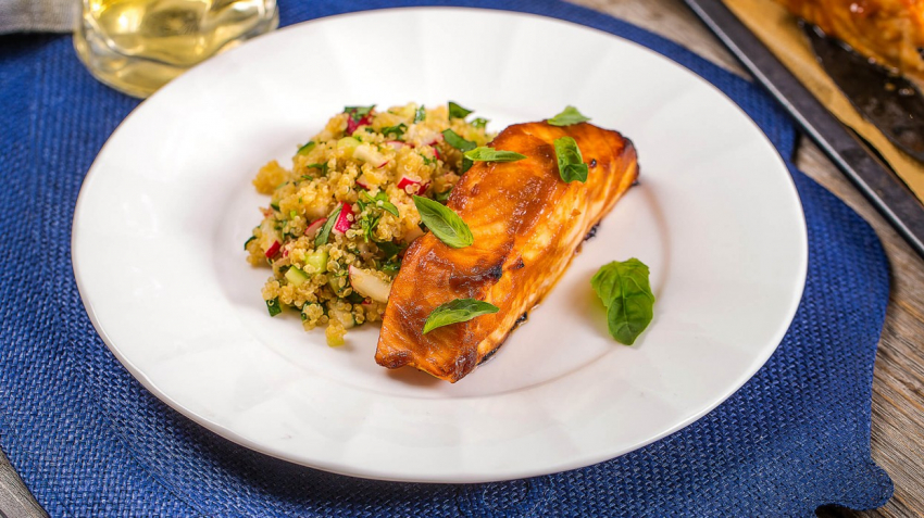 - Ужин: запеченный лосось с киноа и зеленью.