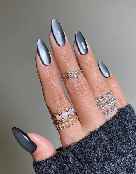А вот что касается новогодних праздников 2025 года, то самым модным дизайном стал «сатиновая кошка». Этот маникюр, выполненный с эффектом «кошачьего глаза», теперь радует глаз не только темными, но и светлыми оттенками, а сияющие частички стали мелкими, словно пудра.