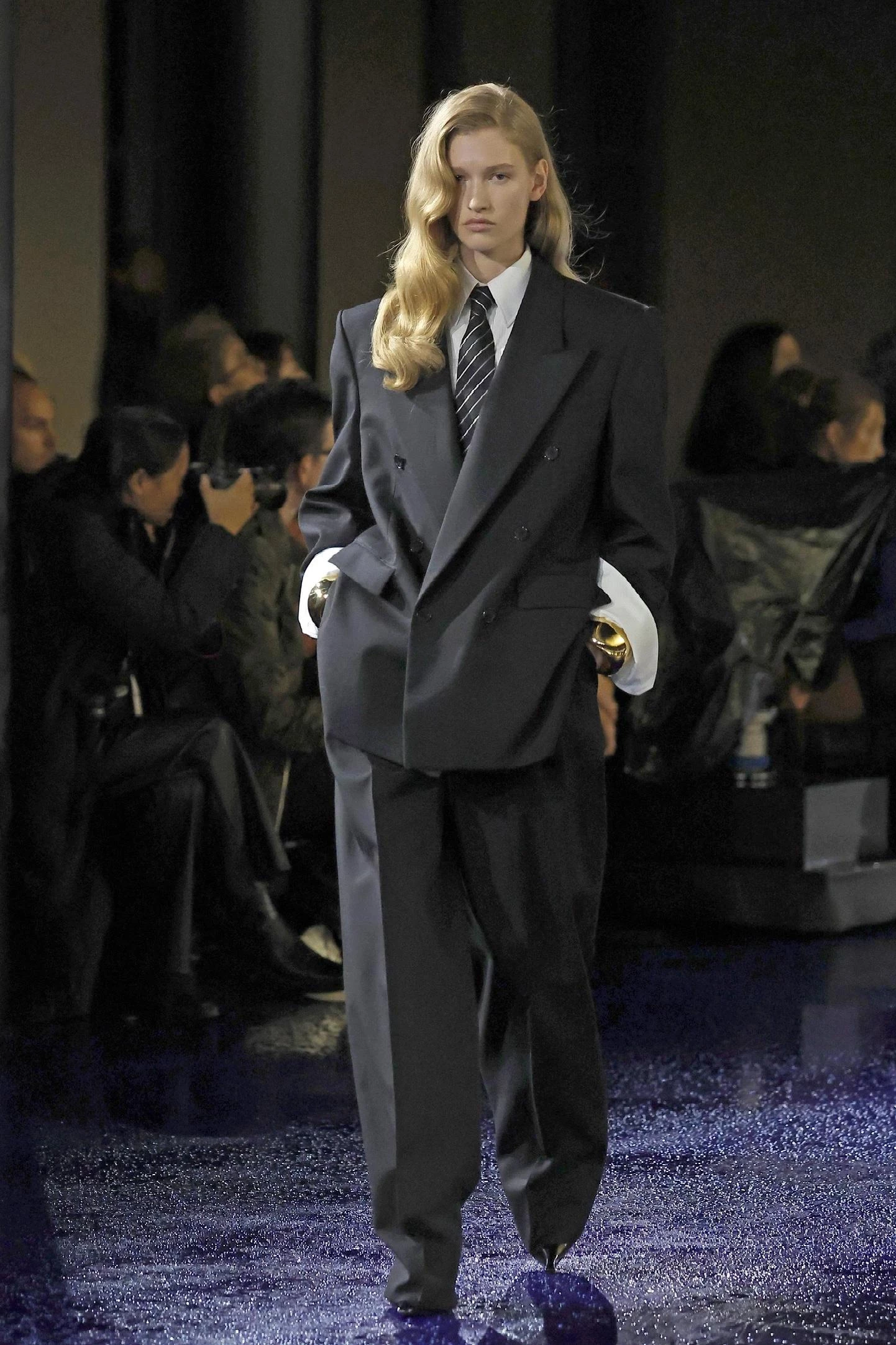 Saint Laurent делает ставку на массивные украшения — крупные браслеты, кольца с цветными (но не драгоценными) камнями, заметные серьги. Они добавляют яркости даже самому сдержанному деловому костюму. В 2025 году аксессуары — не дополнение, а полноценная часть лука. Это легкий способ разбавить офисную строгость и подчеркнуть свою индивидуальность.